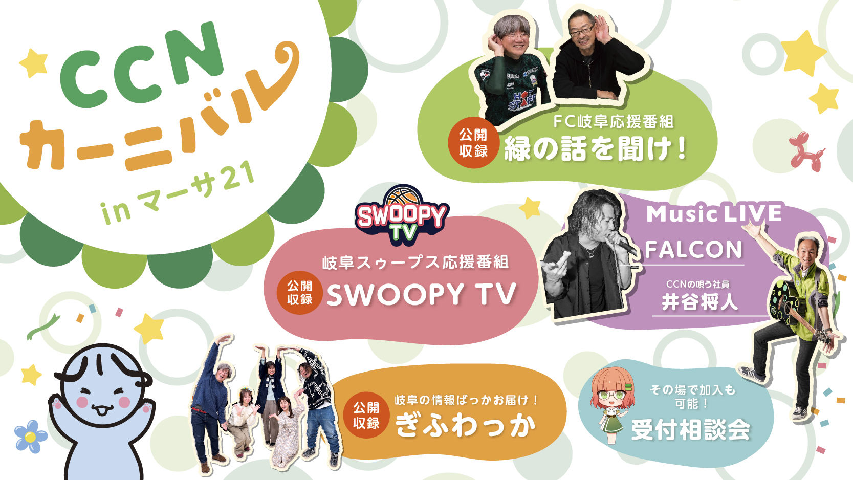 ぎふわっか・緑の話を聞け!・SWOOPY TV の3番組の公開収録や、FALCON LIVE・井谷LIVEなど、1日を通したイベントの模様を放送します。