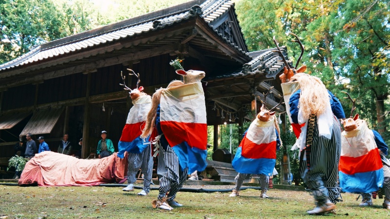 高知県四万十町・地吉地区の「五ツ鹿踊り」。太鼓の音に合わせ、鹿の面をつけた男たちが舞います。古くより受け継がれてきた、山里の人々の祈りと誇りの舞。山あいに響く太鼓の音が、今も祭りの心を伝えます。