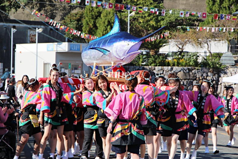 かつて遠洋漁業で栄えた三重県南伊勢町宿田曽地区で続く秋祭り。祭りには、住民だけでなく宿田曽を故郷に想う人々が集まり、子どもから大人までがわいわい楽しく神輿を担いで宿田曽漁港周辺を練り歩きます。様々な神輿が登場し、男衆で担ぐカツオ神輿や舟神輿、そして女性だけで担ぐカジキマグロ神輿も圧巻。祭りの合言葉は「村の元気は祭りから!」
